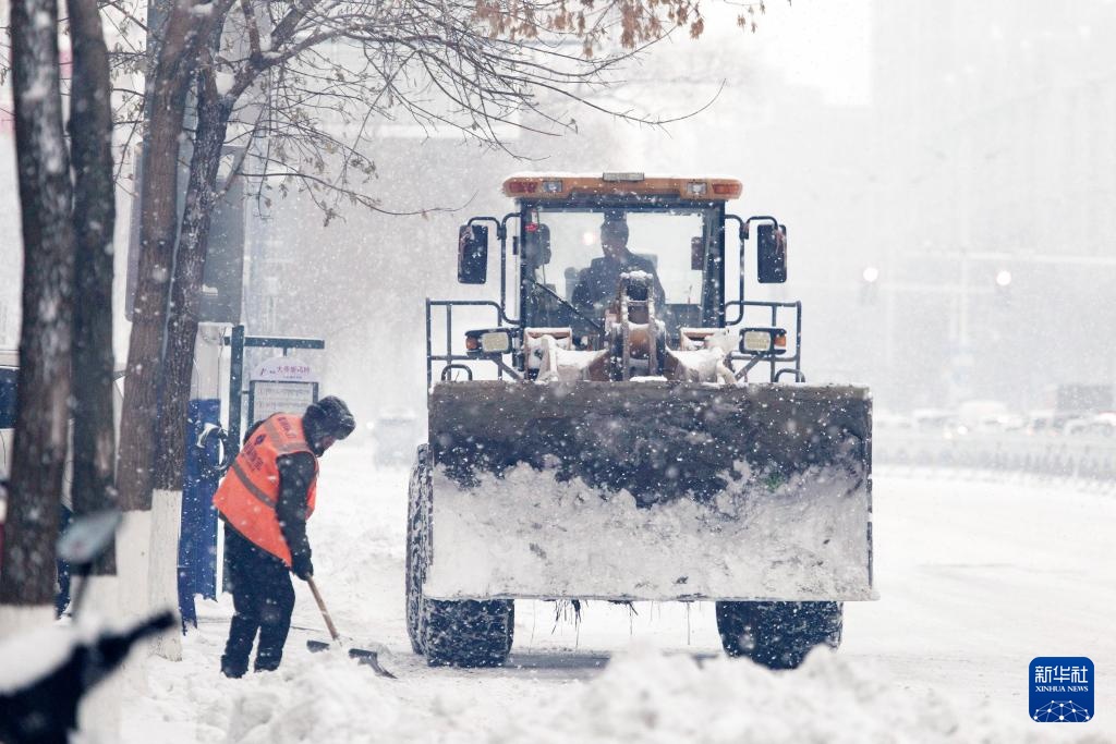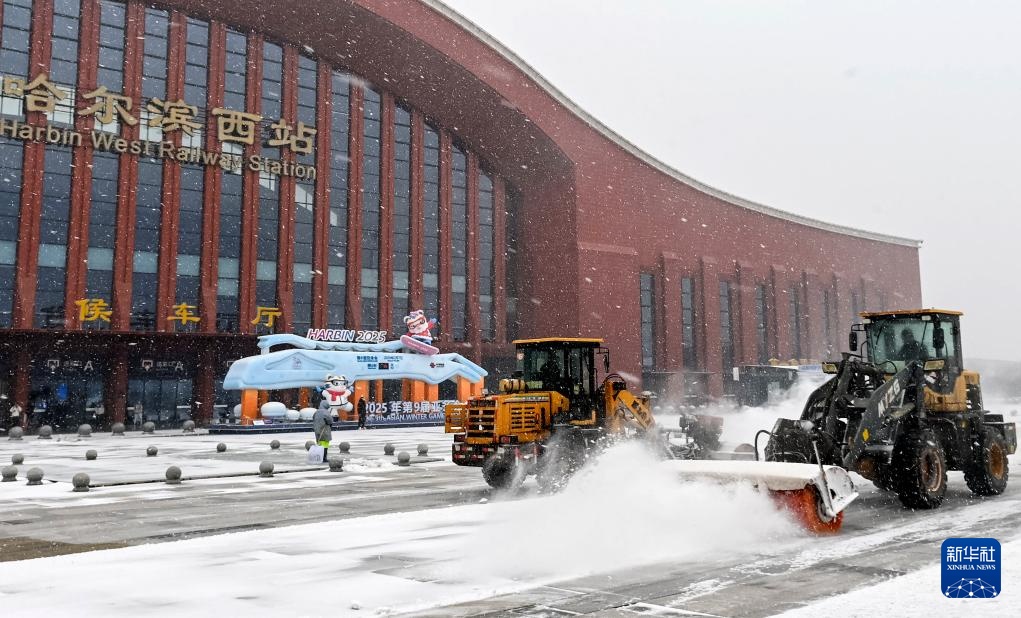 11月26日,清雪车辆在哈尔滨西站广场前清理积雪。