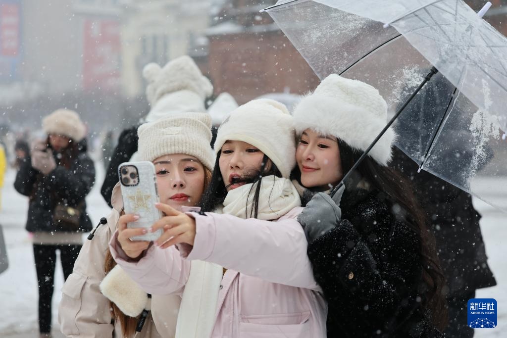 11月26日,游客在哈尔滨建筑艺术广场雪中留影。
