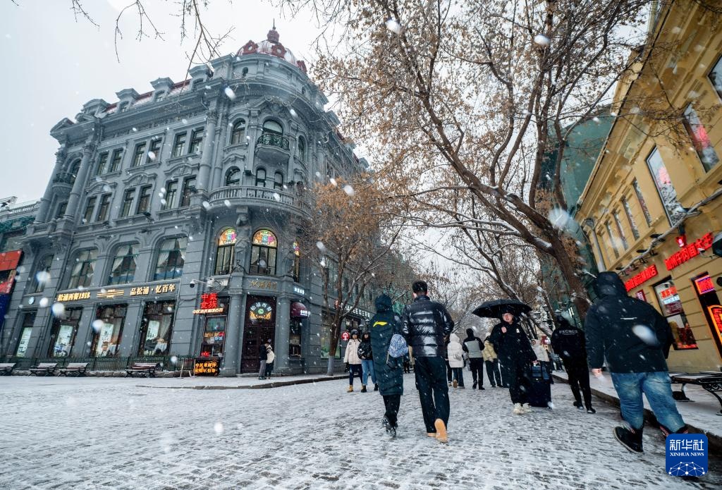 11月26日,市民游客在雪中的哈尔滨中央大街步行街行走。