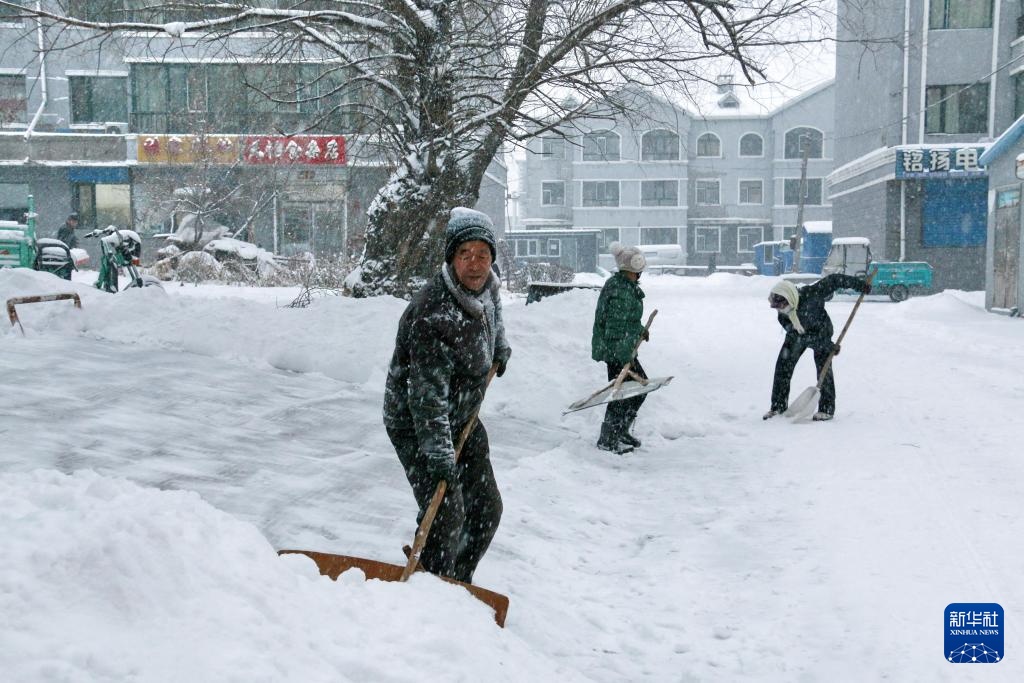 11月26日,居民在位于黑河市的北大荒集团格球山农场有限公司场区清理积雪。
