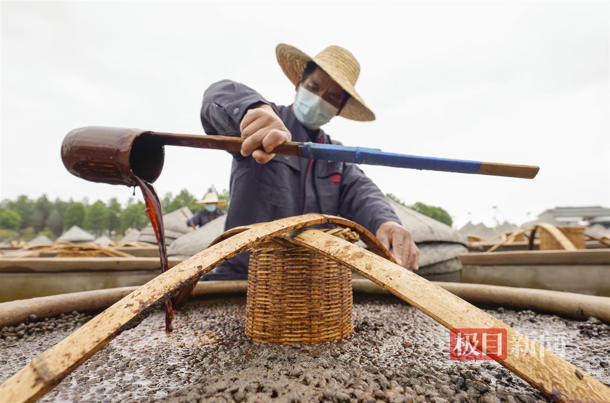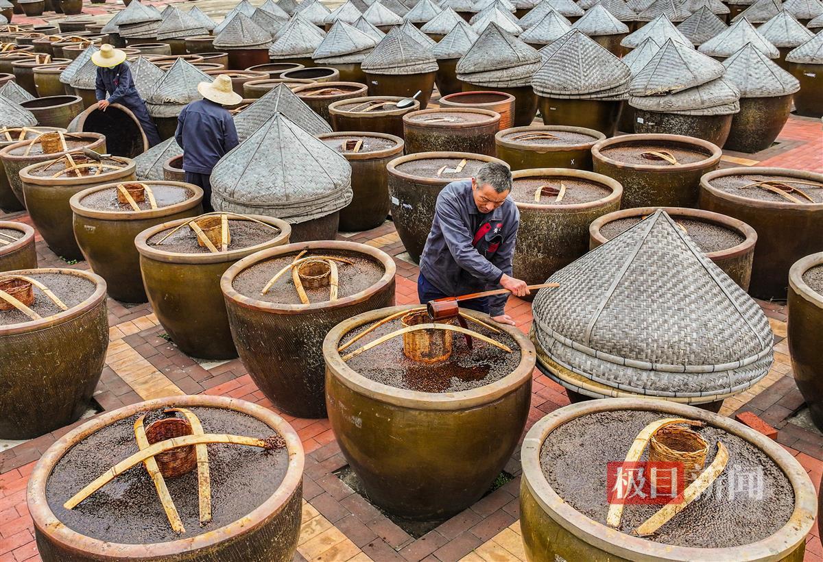 眼下,在应城市田店镇有名店林场的深处,3000口酱缸正散发着丰收的酱香,这里,纯手工古法酿造的黄滩酱油,正在进行“提油”的程序。