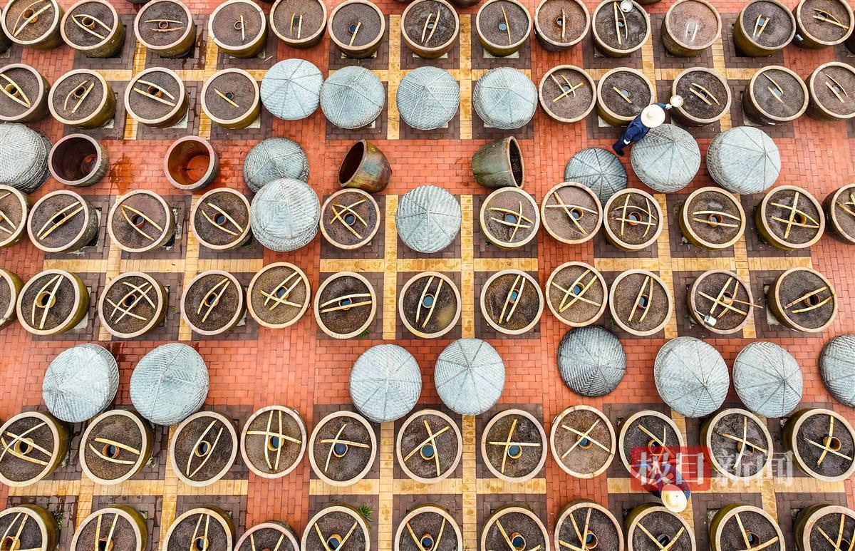 11月20日,极目新闻记者慕名而来,寻访隐藏在林海中的非遗味道。蜿蜒的旅游公路两侧,林木茂密,风景如画。进入应城市恒茂食品有限公司的大门,扑面而来的就是浓浓的酱香。在一个约25000平方米的天然大晒场上,3000口盖着斗笠的酱缸依次排列,场面壮观。