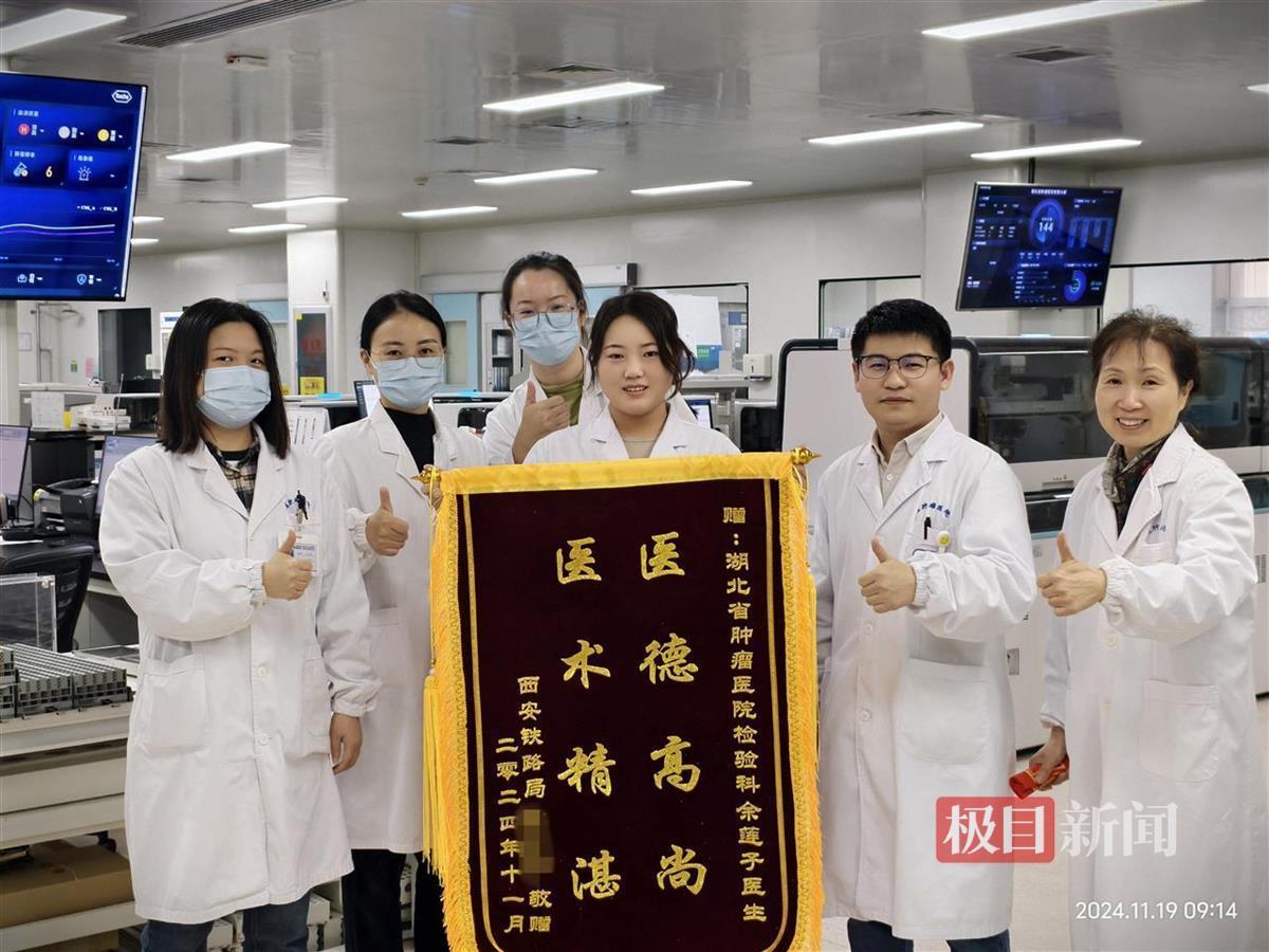11月19日,湖北省肿瘤医院检验科收到一面来自西安铁路局的感谢锦旗。原来,该科室的年轻医生余莲子,在10月29日的一次高铁旅途中,紧急救治了一位突发急症的列车乘务员。如果不是这面锦旗,其他同事还不知道余莲子又一次在旅途中出手救人。