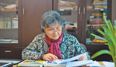 图为钱小萍正在审阅设计稿。 受访者供图 |