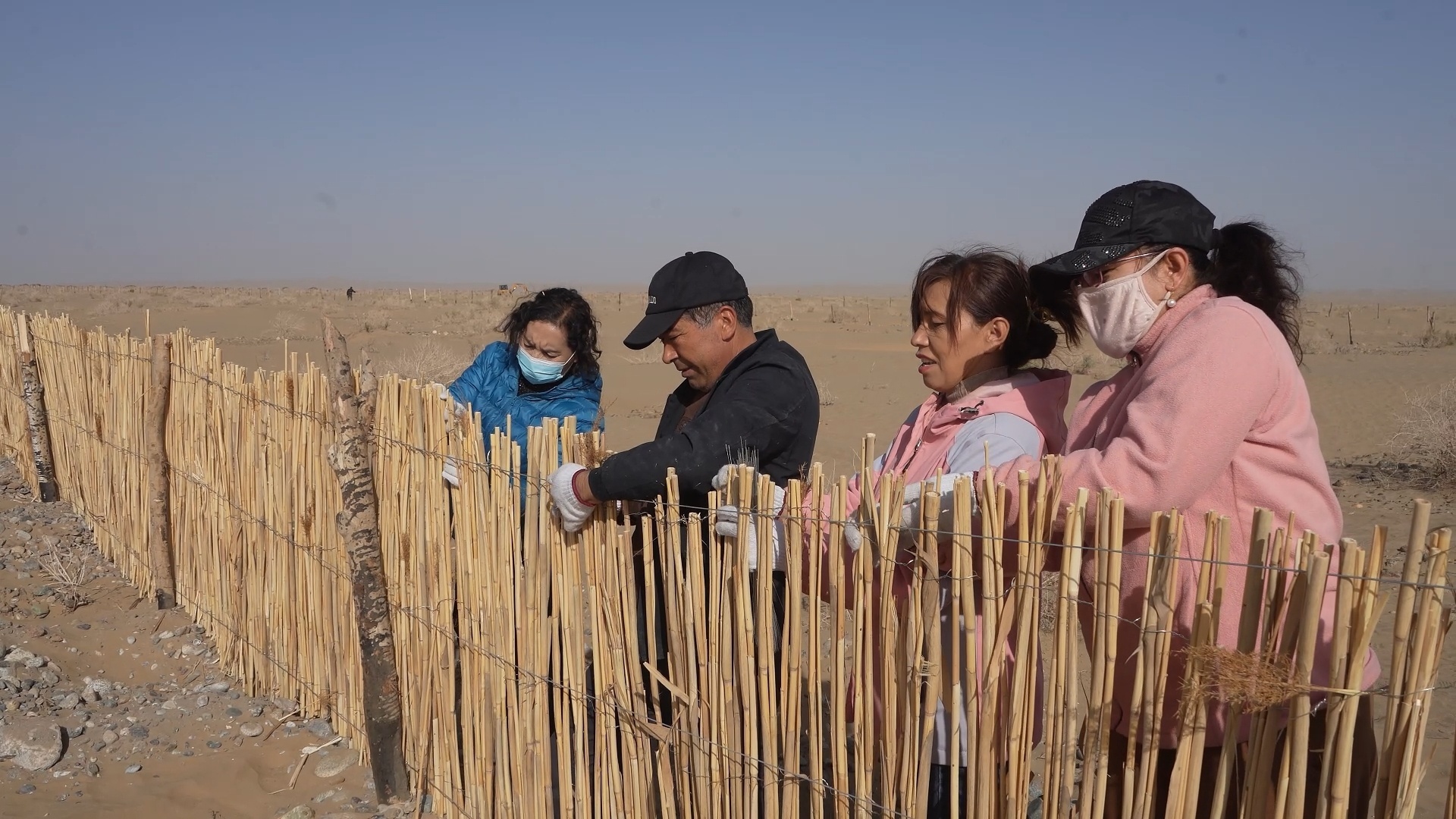 邓晓波:你看,我们3米一个桩子,往下打40公分左右,这样结实,而且有三道铁丝进行牢固。风从芦苇缝里面吹过,沙就留在芦苇上面,把沙子进行固定。皮山县的风向是西风和西北风,这一段地貌属于戈壁,土层比较贫瘠、比较薄,地下水位比较低,我们按照“因害设防”的要求,科学规划设立高立式沙障,为南面发展新能源基地,高速公路和铁路设立一道屏障,对国家重要设施起到一种保护作用。
