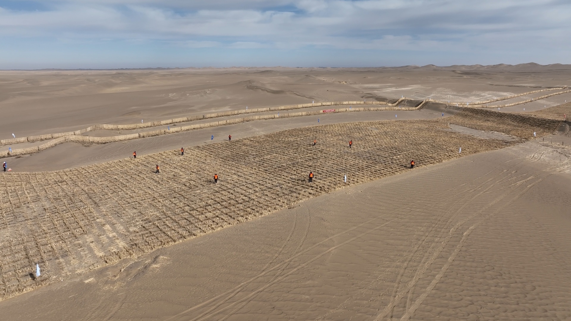 昨天(27日),在新疆维吾尔自治区和田地区皮山县境内的塔克拉玛干沙漠风口,施工队正在利用工程治沙的方式,让一个个高立式沙障如楔子一样钉在沙漠之间。和田地区林业和草原局党组书记邓晓波介绍,工人需要先以两至三米的间隔,在流沙之中打入木桩,而后,再将芦苇秆固定在木桩之间的铁丝网上,一个个木桩和芦苇秆的组合连在一起,形成一片片长度约40米、宽度在20米左右的沙障方格。