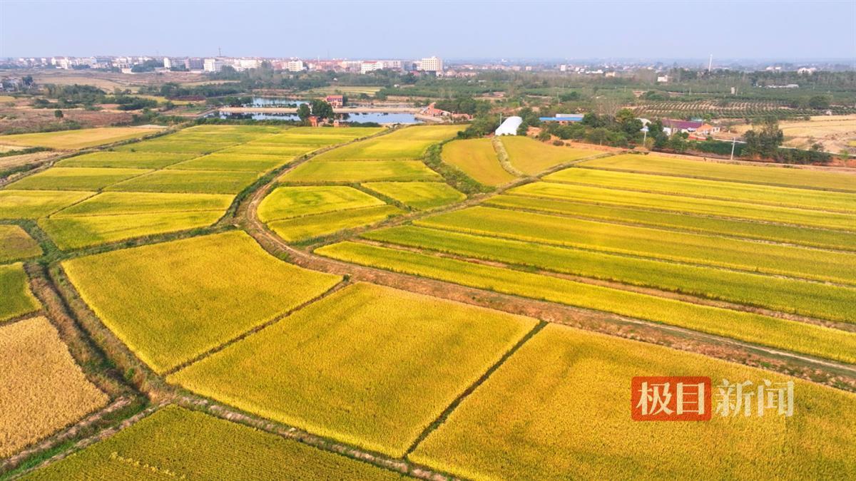 从高空俯瞰,孝昌县邹岗镇的万亩稻田与乡村农舍、蓝天白云相互映衬,构成一幅金光灿烂的美丽乡村田园画卷。
