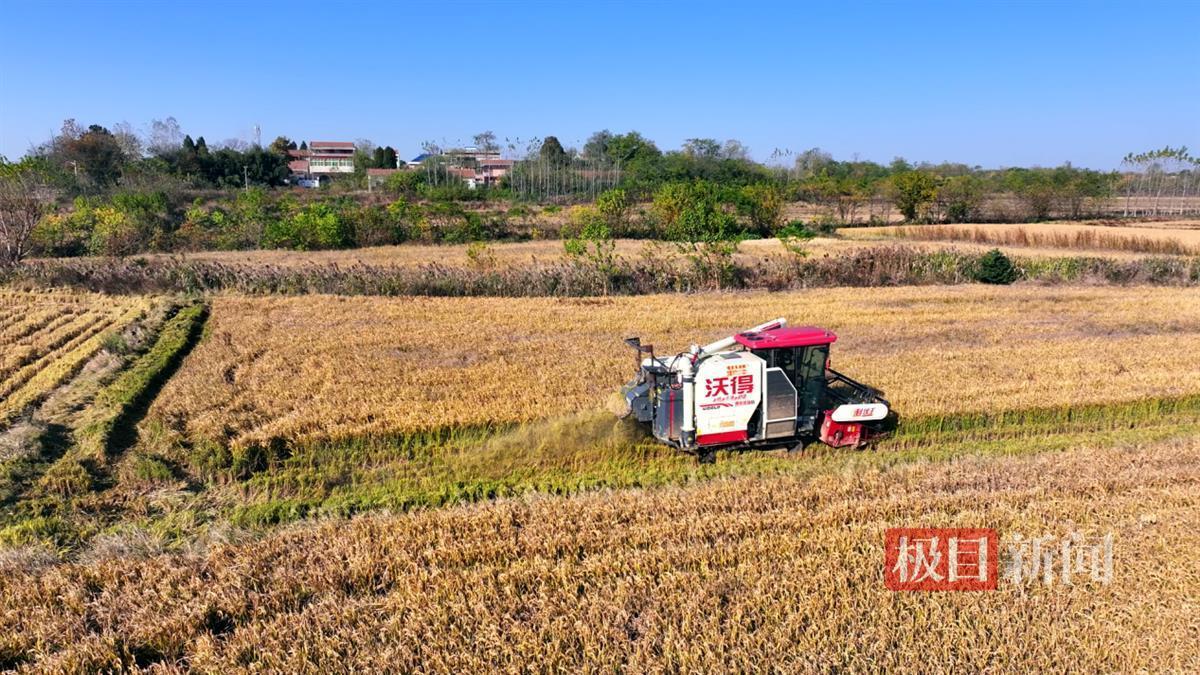 连片水稻田随风摇曳,收割机在稻田来回穿梭,机身隆隆,一串串饱满的稻穗卷入齿轮,收割、脱粒、吐秆、装车,机械化收割一气呵成,高效有序。