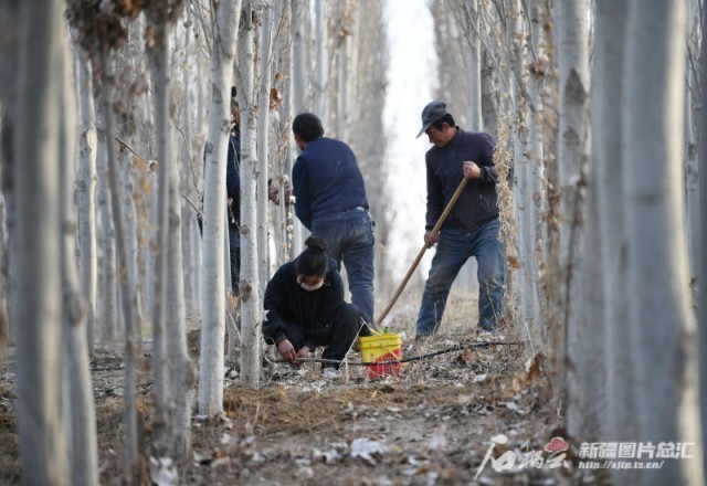 11月28日,护林员在叶城县20万亩生态林基地管护白杨树。