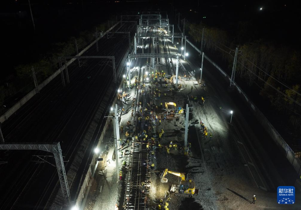 11月28日晚,工人在进行道岔插铺施工(无人机照片)。