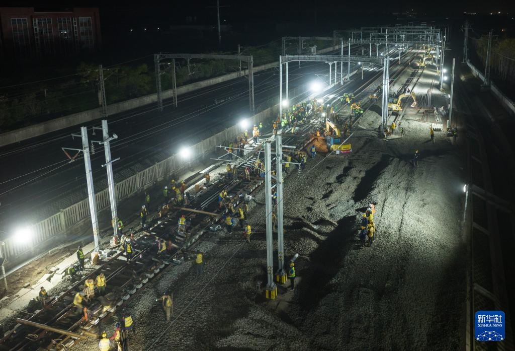 此次插铺的42号道岔全长157.2米,总重量达262吨,建设者经过8小时连续施工,拆除既有线路,并将两组42号道岔分别横移11米、纵移160米后完成铺设。