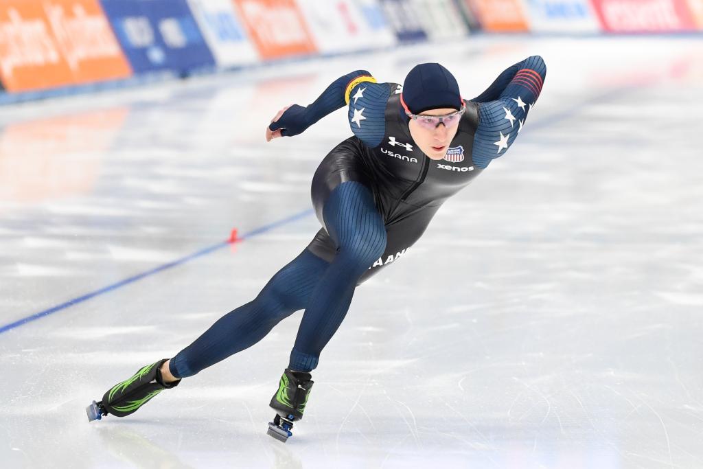 11月29日,美国选手斯托尔兹在比赛中。他以34秒27的成绩获得男子500米第一次比赛冠军。新华社记者 鞠焕宗 摄