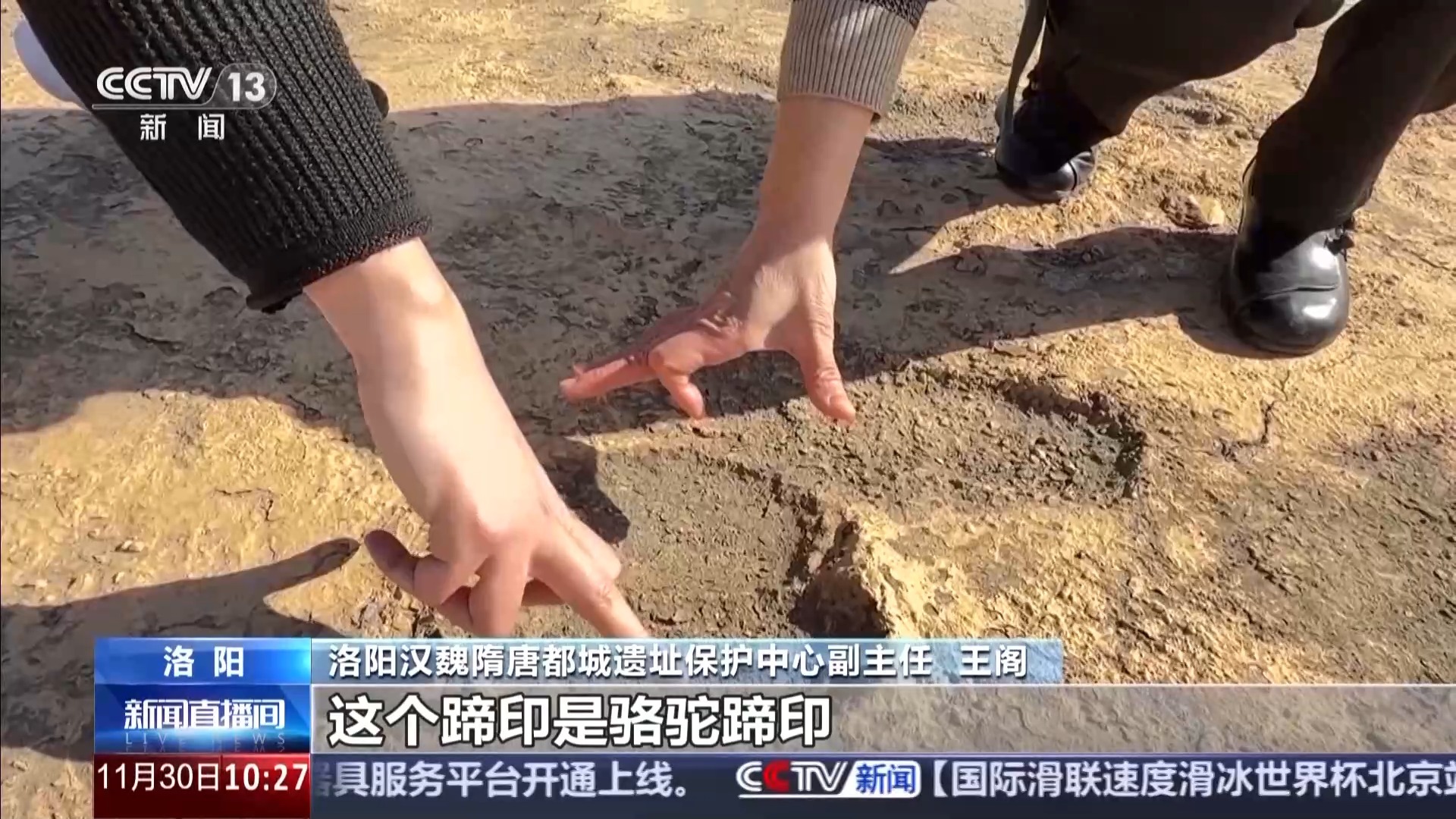 洛阳汉魏隋唐都城遗址保护中心副主任 王阁:这里头可以看到密集的车辙印和大大小小的不同的脚印,这个蹄印是骆驼蹄印,这也是我们丝绸之路的有力的物证。