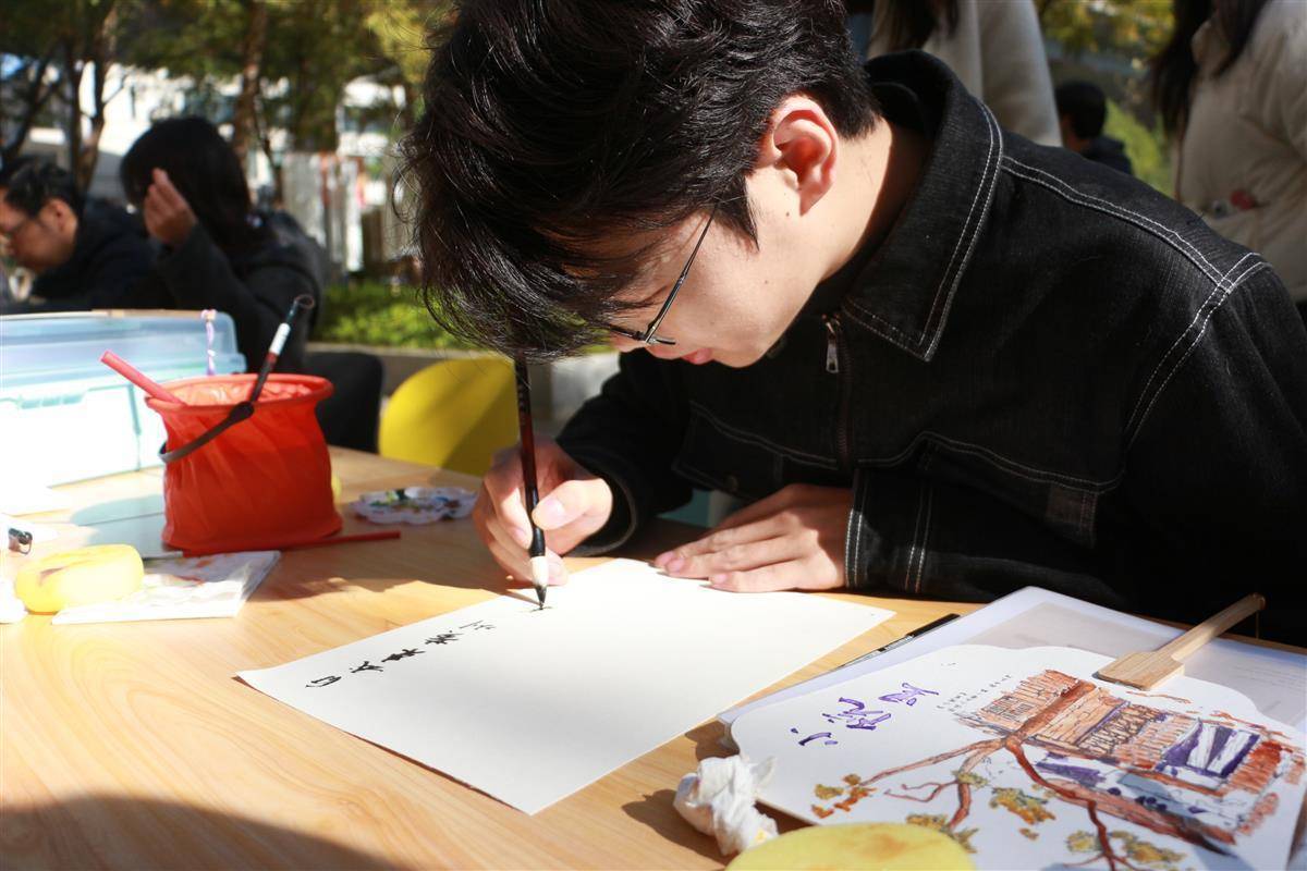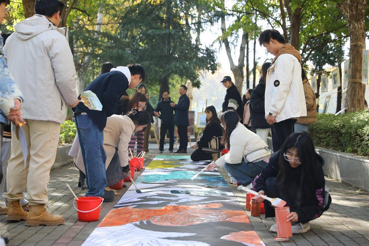 现场还增设了“作品共创区”和“互动区”。在共创区,一幅长16米的太行山脉轮廓线稿铺陈开来,师生们拿起颜料和画刷共同添色,气氛热闹。在互动区,新颖的团扇绘画活动备受欢迎,师生们在志愿者的指导下,利用多彩颜料在扇面上彩绘精美图案,创作出各具特色的作品。其中,机电zsb2304班金攀同学以一手好字,为扇面添彩,赢得阵阵赞叹。