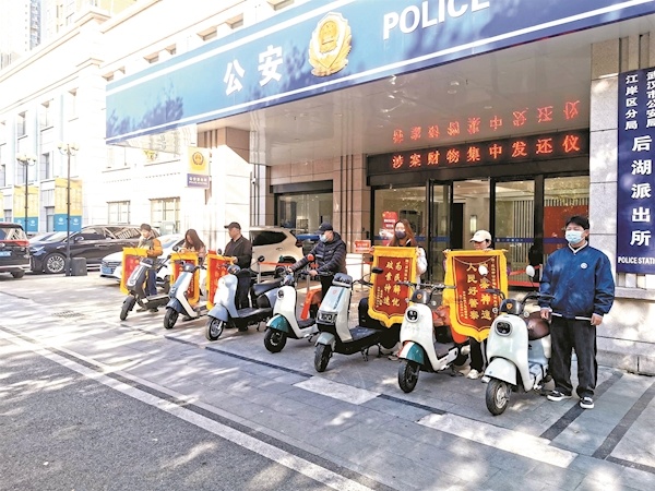 11月28日上午,寒风阵阵。武汉市公安局江岸区分局后湖街派出所门前,暖意融融。7辆电动自行车一字排开,7名车主喜滋滋地在领取通知单上签名,领回了心爱的电动自行车。