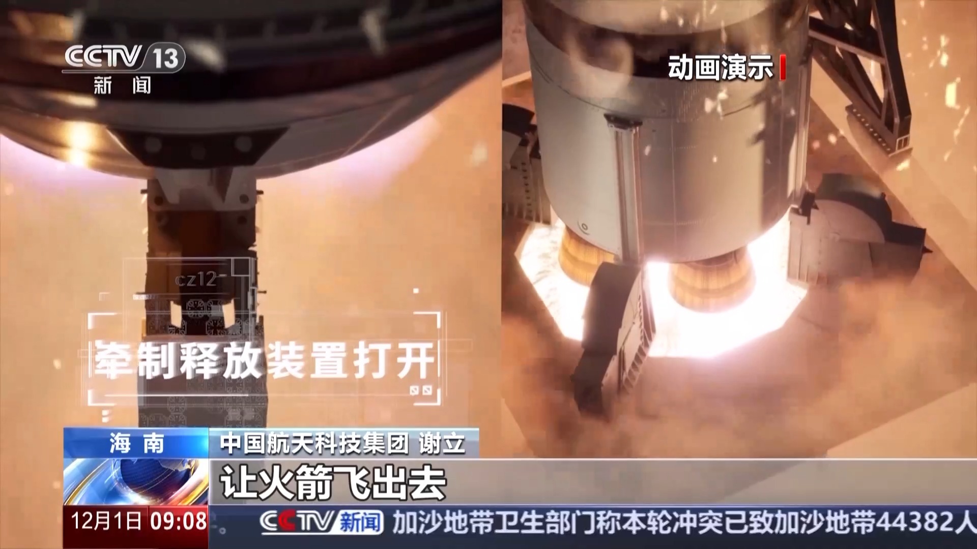 中国航天科技集团 谢立:火箭点火之后,发动机75%工况让火箭在发射台上工作,在短短的零点几秒时间内,我们对火箭进行故障诊断。诊断到火箭是正常以后,我们把牵制释放机构打开,让火箭飞出去。这样能够确保火箭点火发射的安全性,同时也确保整个地面设备的安全性。