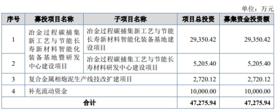 瑞尔竞达原拟募资47,275.94万元,用于冶金过程碳捕集新工艺与节能长寿新材料智能化装备基地暨研发中心建设项目、复合金属相炮泥生产线技改扩建项目和补充流动资金。