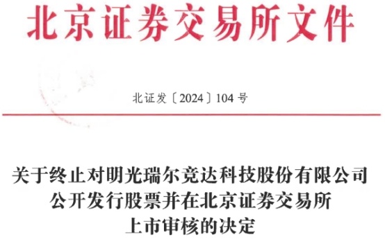 2024年10月15日,瑞尔竞达向北交所提交了《明光瑞尔竞达科技股份有限公司关于撤回向不特定合格投资者公开发行股票并在北京证券交易所上市申请文件的申请》。根据《北京证券交易所向不特定合格投资者公开发行股票并上市审核规则》第五十五条的有关规定,北交所决定终止瑞尔竞达公开发行股票并北交所上市的审核。