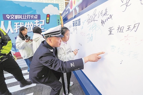 小朋友在文明交通“承诺墙”上签名