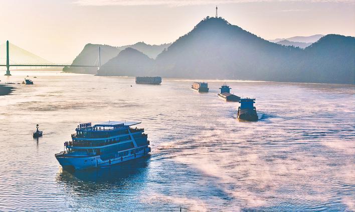 11月28日清晨,初冬的长江宜昌段云蒸霞蔚,江面缕缕升腾的白雾中,一艘艘大型货轮穿云破雾般行驶在葛洲坝水域。据了解,时下正值长江宜昌段枯水期,为保障船舶航行安全、满足航运对航道尺度的需求,长江航道部门组织对长江水道开展疏浚保畅施工,确保长江航道更加畅通。