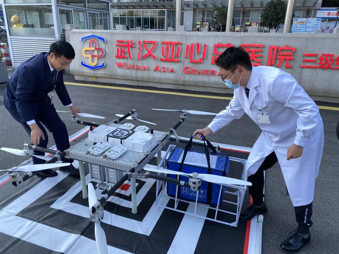 武汉亚心总医院医护人员上前打开挂篮、拿取血液,迅速赶往心外科手术室给病人输血。从起飞到降落仅19分钟,武汉血液运输无人机首飞,为心血管病人手术抢出珍贵的20分钟。