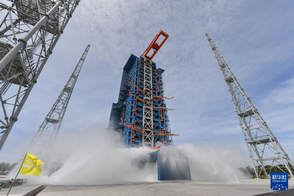 在位于海南文昌的海南商业航天发射场一号发射工位拍摄的喷水试验(6月30日摄)。当日,海南商业航天发射场开展双发射工位合练,为首次发射任务做准备。