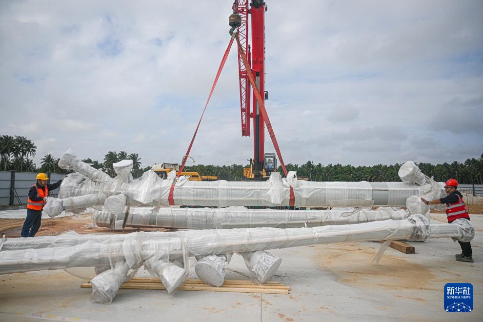 工人在位于海南文昌的海南商业航天发射场一号发射工位转运设备构件(2023年1月23日摄)。此时该工位已基本完成前期土建工程,开始进行设备安装施工。
