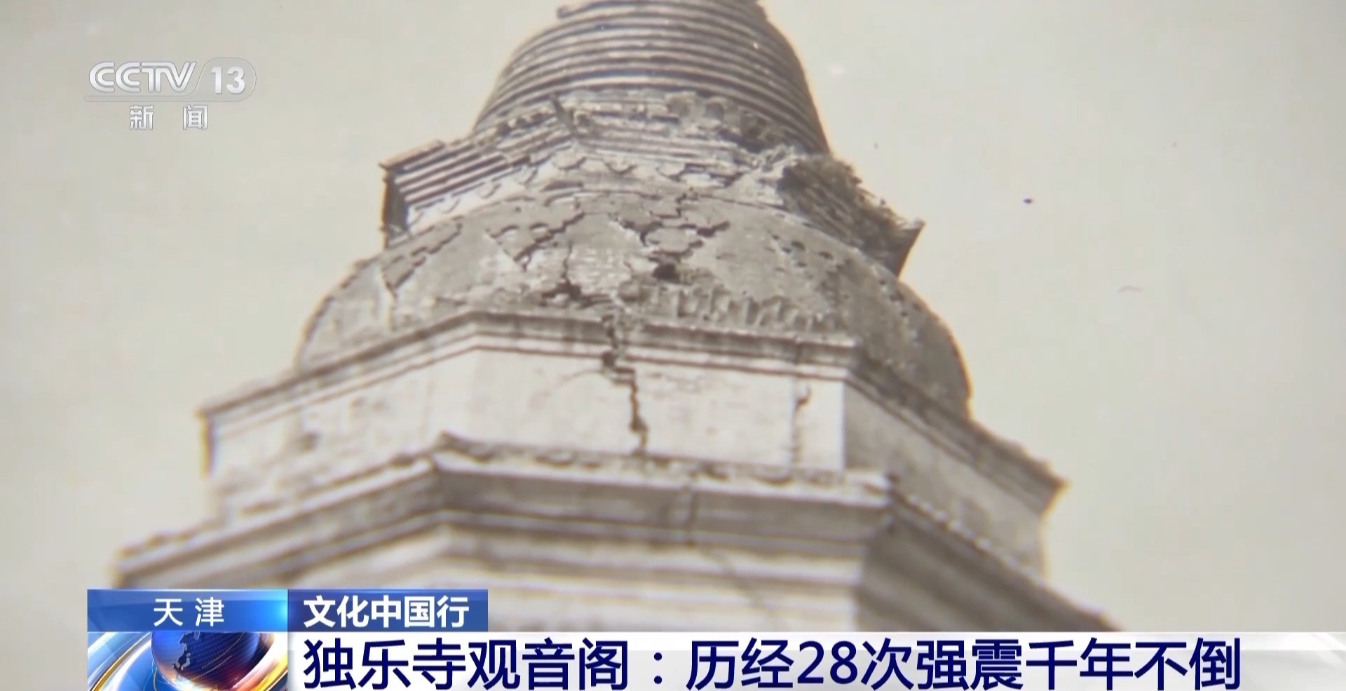 原蓟州区文化和旅游局副局长 蔡习军:1976年的时候唐山大地震我就住在鼓楼下面,离这有100多米,震感非常强烈,人都站不住。在余震的情况下,观音阁是向东西方向摇摆,左右摇摆将近两米。当时,看着观音阁想着这下要完了,要倒了,但是余震过后它又恢复原位了。
