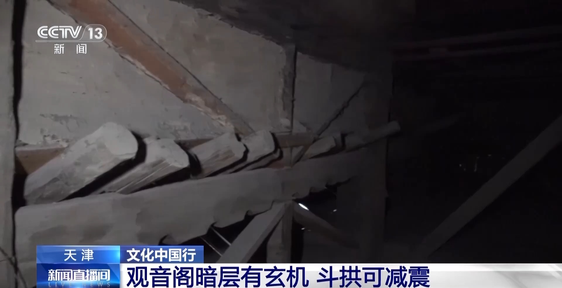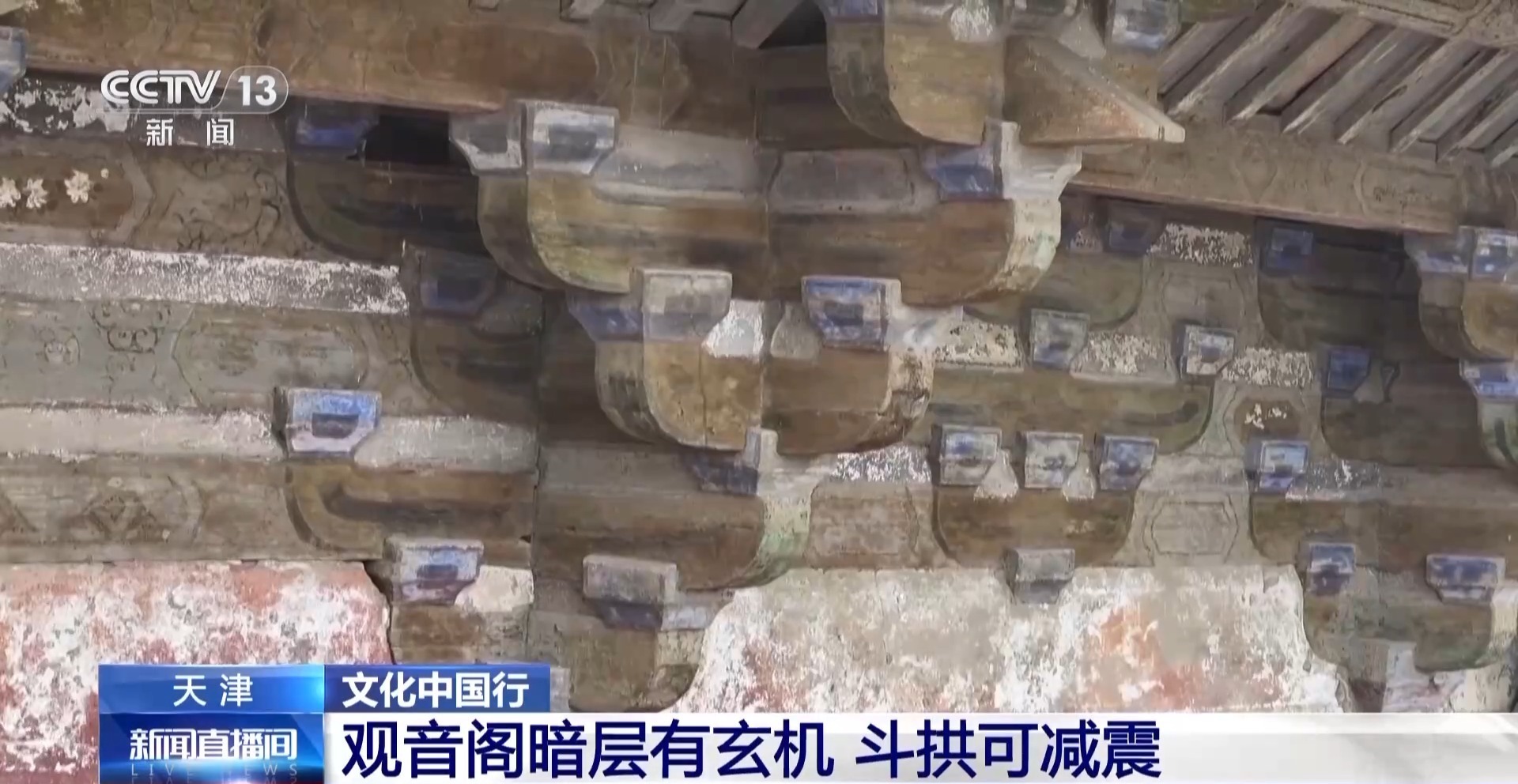 蓟州区文化遗产保护中心副研究馆员 宋淑云:高层建筑的中部比较脆弱,特别是当地震来临的时候,容易折损、扭曲、变形。我们的古人就非常有智慧,他们在观音阁的中间增加了一个暗层,所以我们表面上看观音阁是两层,其实中间还有一个暗层。