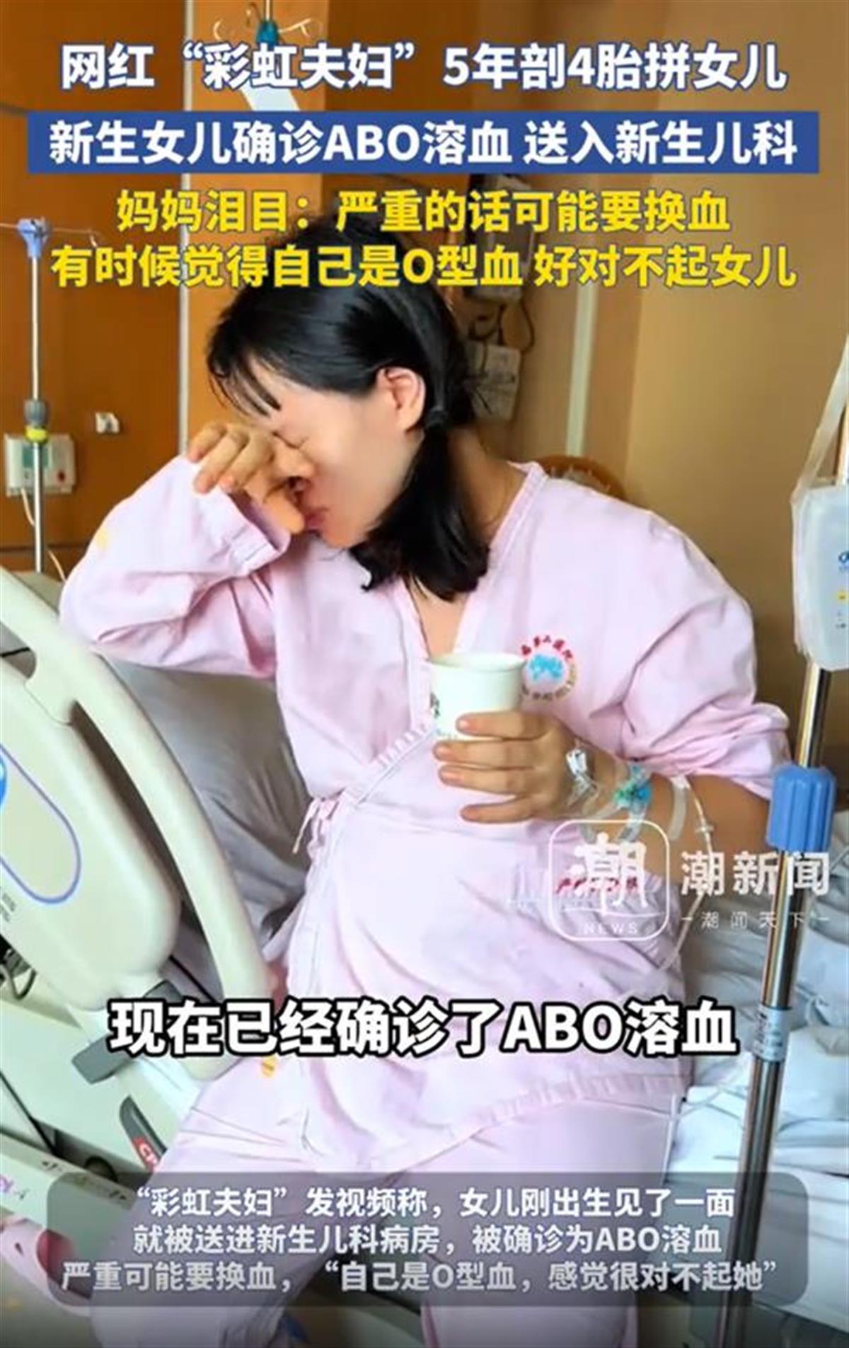 “彩虹夫妇”发视频称,女儿刚出生见了一面就被送进新生儿科病房,被确诊为ABO溶血,严重可能要换血,“自己是O型血,感觉很对不起她。”她泪目表示:“给你准备了粉色小衣服,妈妈4剖才把你盼来,我们一起加油。”