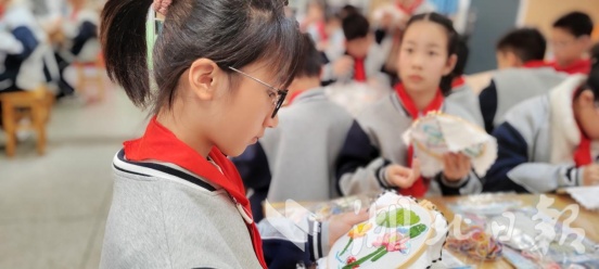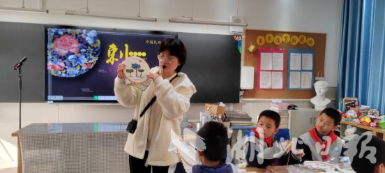 “汉绣是湖北的骄傲,中华的瑰宝。一辈辈的汉绣艺人飞针走线,倾囊相授,才使汉绣技艺得以代代传承……”在美术老师郭婕的介绍中,孩子们了解了汉绣的发展历史、艺术特色、使用工具、工艺流程,更是对汉绣产生了浓厚的兴趣,纷纷踊跃动手实操。