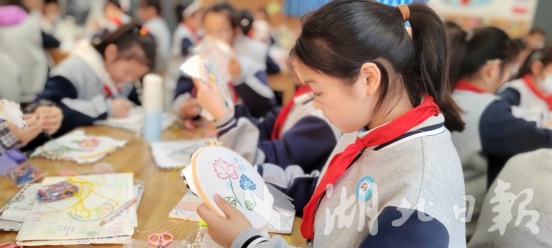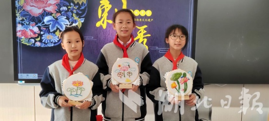 青山区钢都小学郭婕老师说:“汉绣是祖辈传下来、留下来的手艺和记忆,要让古老优秀的文化‘活’在当下,焕发生机活力,还需更多孩子们的关注和参与,让荆楚非遗文化在学校生根发芽。”