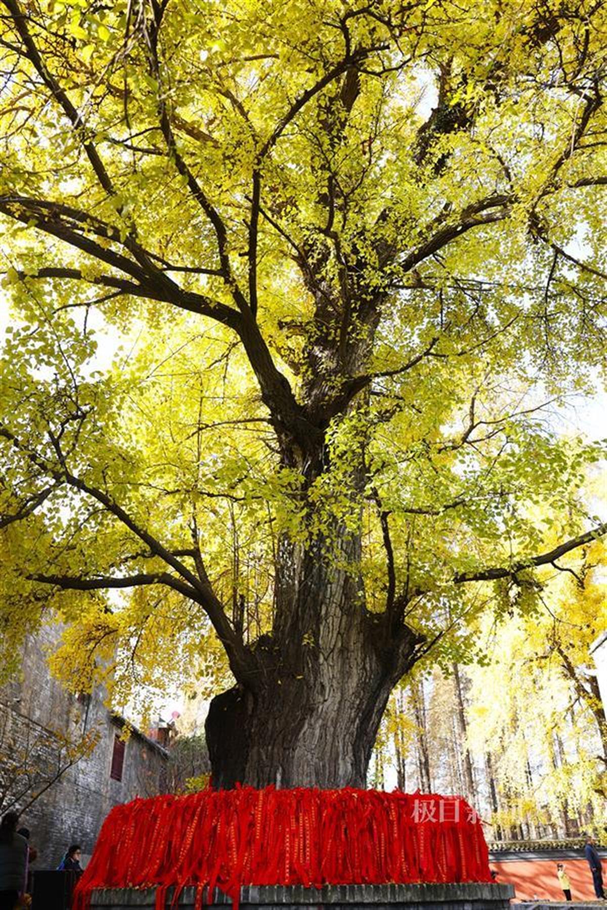 因连日的温暖天气,入冬后它才终于变得金黄。微风拂过,茂密且茁壮的千年银杏沙沙作响,飞舞的金色叶片在阳光下熠熠生辉,似龙鳞金甲,吸引了大批游客前来观赏拍照。