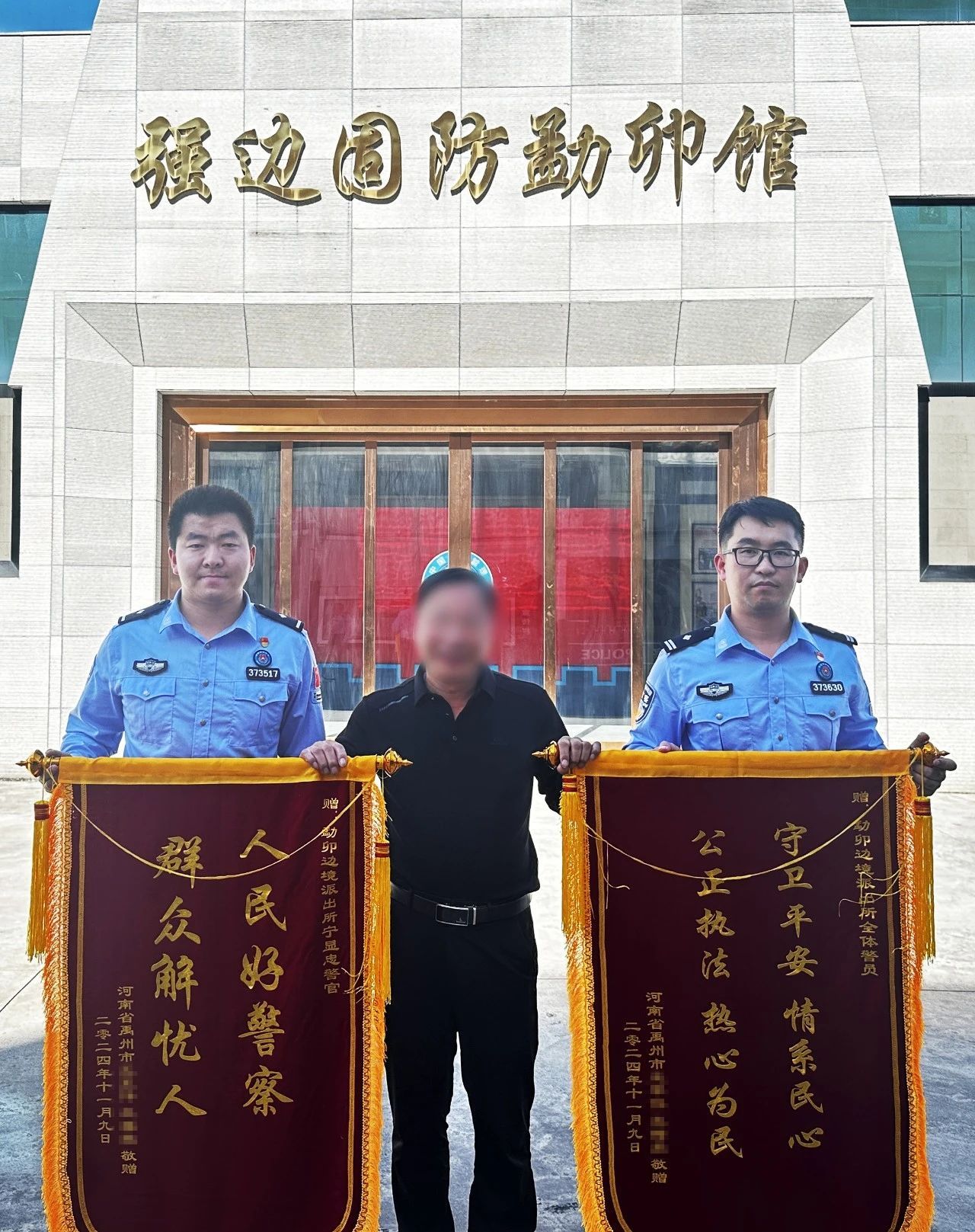 王先生给民警宁显忠(左)和派出所送来两面锦旗