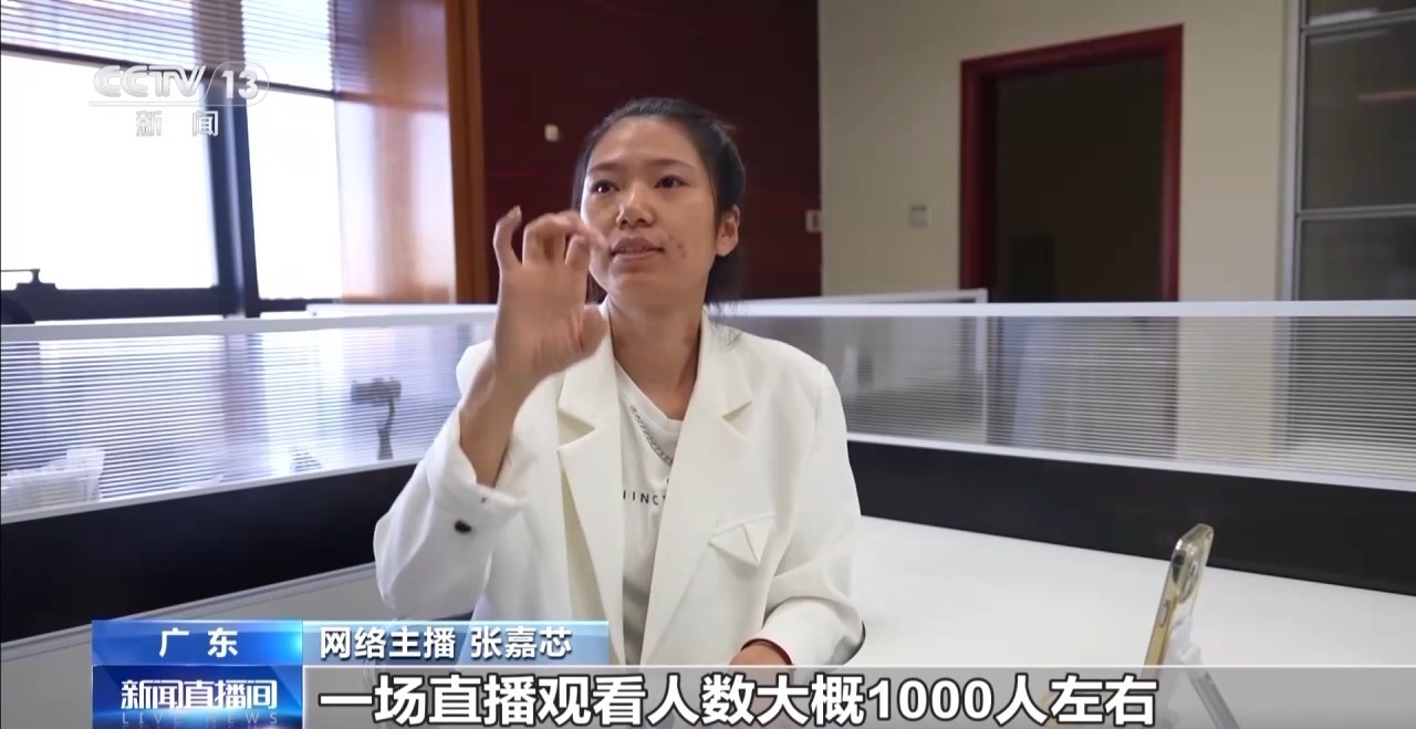 网络主播 张嘉芯:我的主要工作是直播(向听障人士)介绍工作细节。一场直播观看人数大概1000人左右。