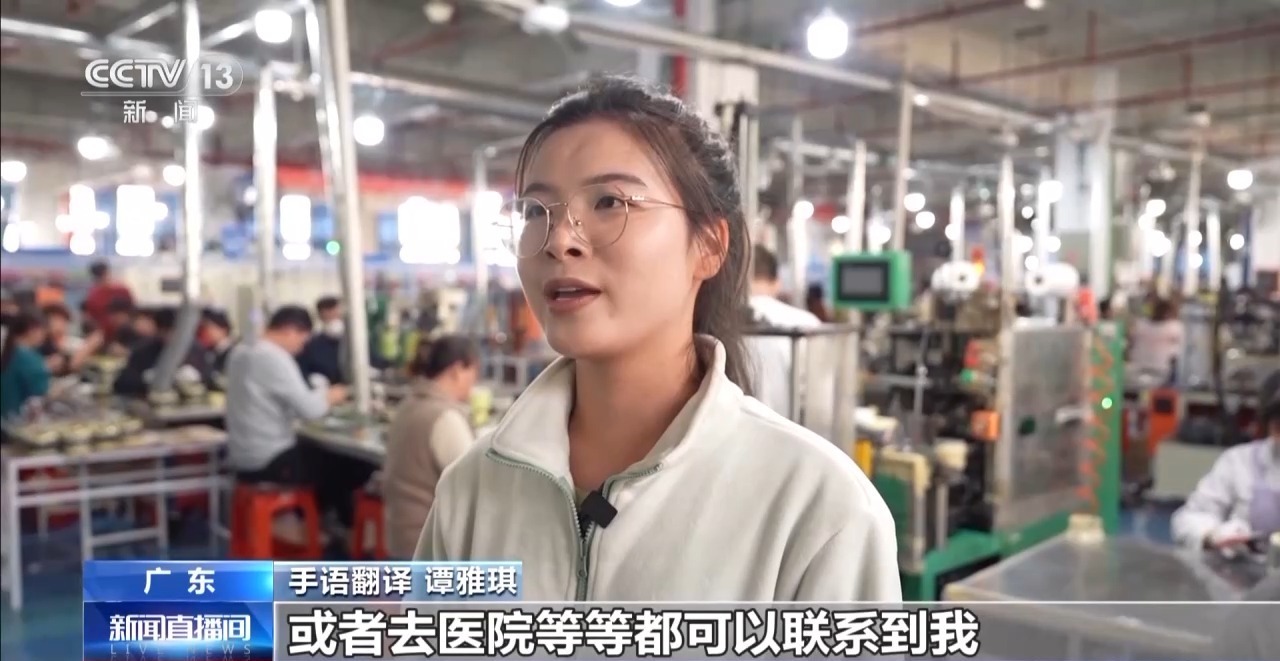 手语翻译 谭雅琪:他们在生活上或者工作上有什么问题都可以联系我,比如说他们要办银行卡呀,或者去医院等等都可以联系我,我帮他们翻译。