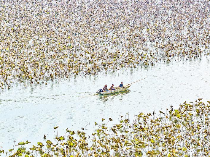 12月3日,荆州菱角湖国家湿地公园护鸟人驾驶小船在湖面上进行护鸟巡查。 (湖北日报全媒记者 刘曙松 通讯员 肖敏 摄)