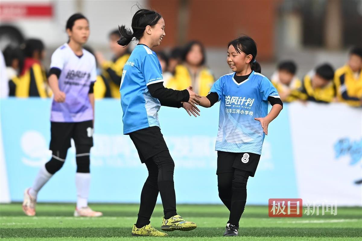 极目新闻记者了解到,本次参赛的三河小学女足球队共有12名队员,以学校五年级学生为班底,平均年龄11岁。一眼看上去,这些姑娘黑黑瘦瘦,个子普遍不高,但丝毫不影响她们的踢球实力,团队合作起来也非常默契。冠军争夺战中,5个进球,她们干净漂亮地拿下对手。