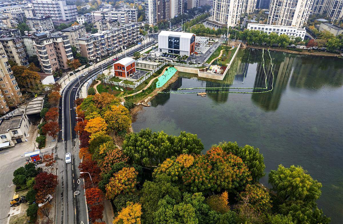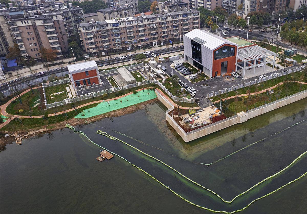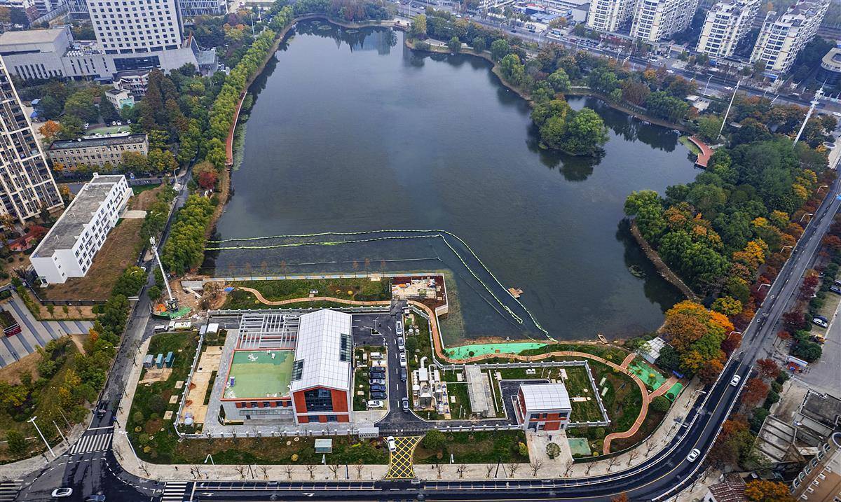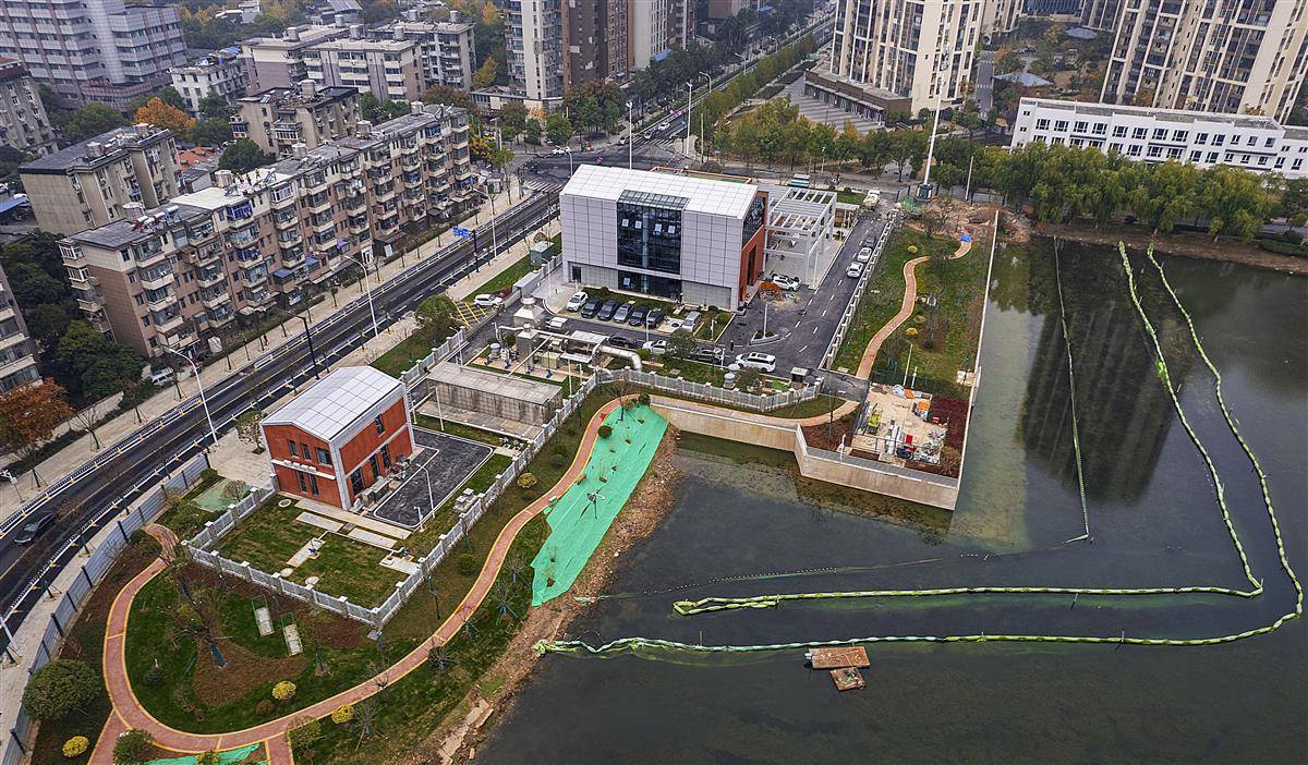 12月4日,鸟瞰位于武昌区内沙湖公园里的前进路泵站改造工程,目前泵站已全面完工,投入使用后将成为武汉市中心城区第一座集排涝、截污、调蓄于一体的综合性排水泵站。
