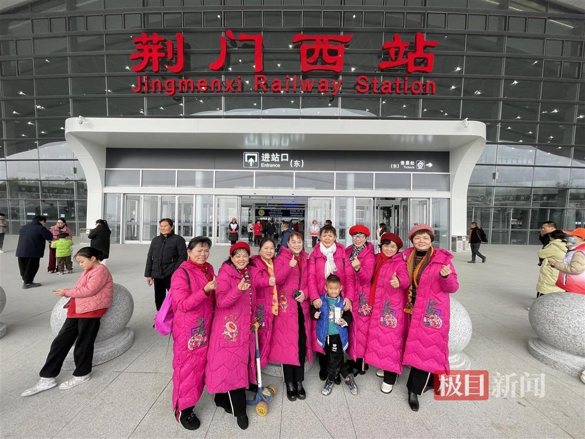 8位统一身着玫红色长裙的阿姨,是荆门市掇刀区名泉社区老年大学舞蹈班的学员。今年65岁的徐慧玲告诉记者,她们一共有14人相约报了荆州的一日游,点名要坐首发车。“荆州其实去过很多次了,但今天第一次坐高铁去,感觉相当不一样!”
