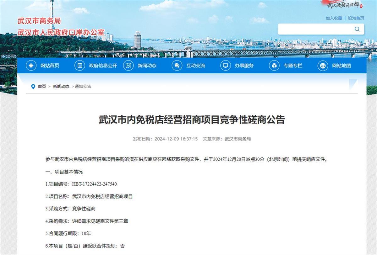 武汉市内免税店有新进展。12月9日,武汉市商务局发布《武汉市内免税店经营招商项目竞争性磋商公告》,将于近期对武汉市内免税店进行经营招商,要求供应商具有免税品经营资质,合同履行期限为10年。