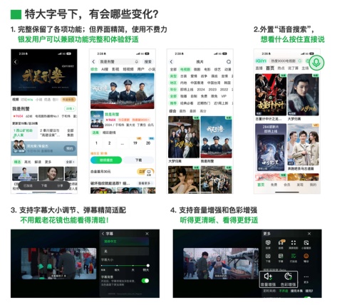 爱奇艺自2021年起开始进行适老化功能改造。2021年9月,爱奇艺率先在标准字号基础上增加了两档大号字体。2021年12月,爱奇艺上线“长辈模式”,页面精选保留了用户最常使用的搜索、播放记录等功能,同时简化操作路径。2023年“长辈模式”再次升级,增加老年群体爱看的片库。截至目前,爱奇艺APP长辈模式已累计使用上千万次。2024年,爱奇艺针对观影场景也提供了更精细化老年群体用户体验,部分影片字幕支持字号调节,播放器里的信息功能更精简、增大热区不易误触,音量增强让老年群体听得更清楚。