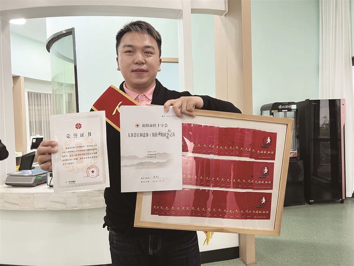 席枫展示的一大沓献血证旁,“中国人体器官捐献志愿登记证书”和“中国造血干细胞捐献荣誉证书”格外显眼。“今年上半年,我完成了献血、献造血干细胞、献遗体器官的‘三献’心愿,非常自豪。”