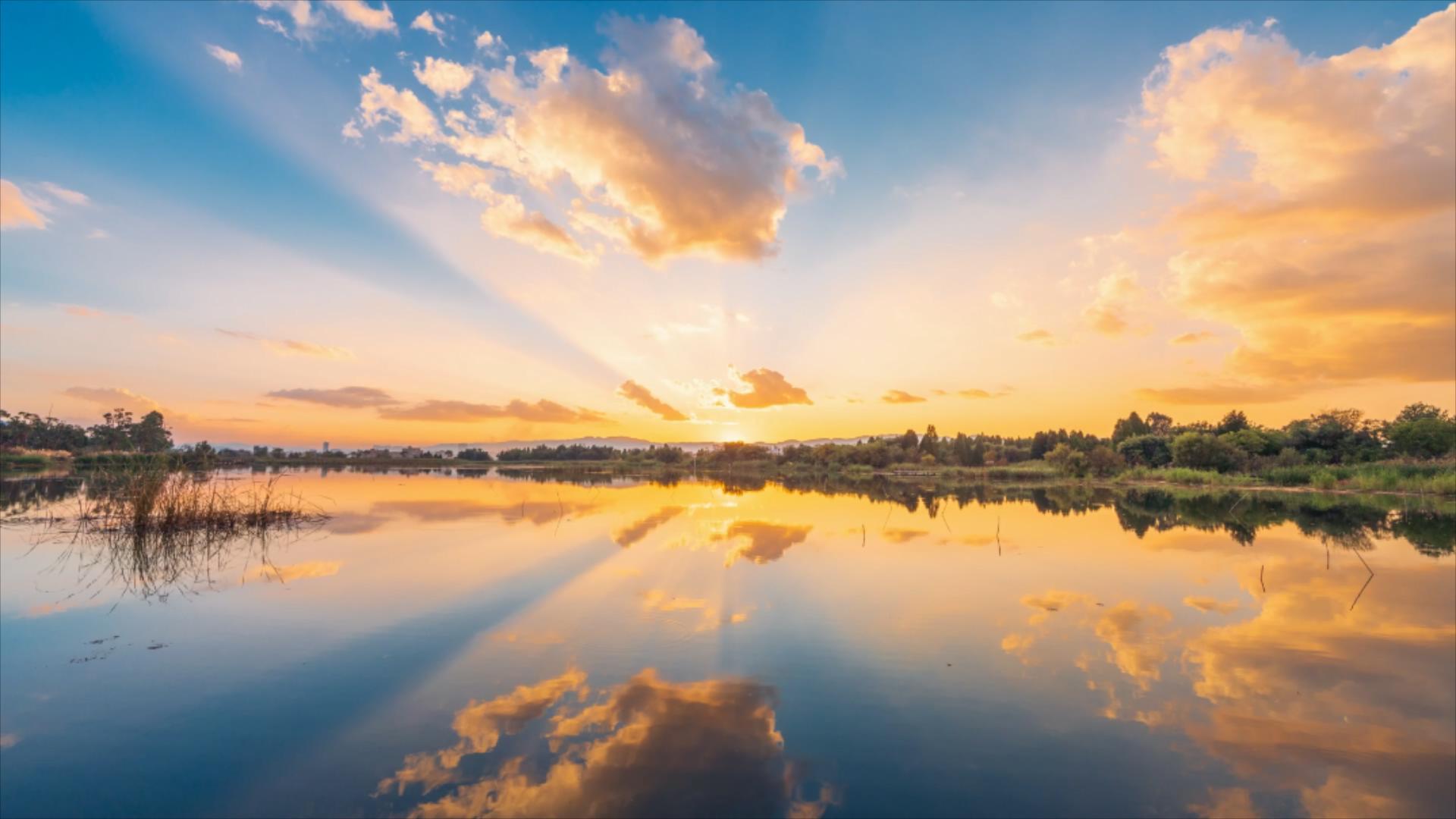 满是蓬勃朝气与静谧诗意的流云霞光轻抚澄碧的湖面,让每一道涟漪都晕染绮丽。
