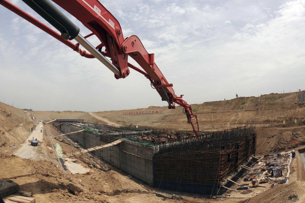 2010年5月18日,河南黄河建工集团施工人员在南水北调中线工程沁河倒虹吸施工现场浇筑厢形预应力钢筋混凝土管身。新华社发(杨帆 摄)