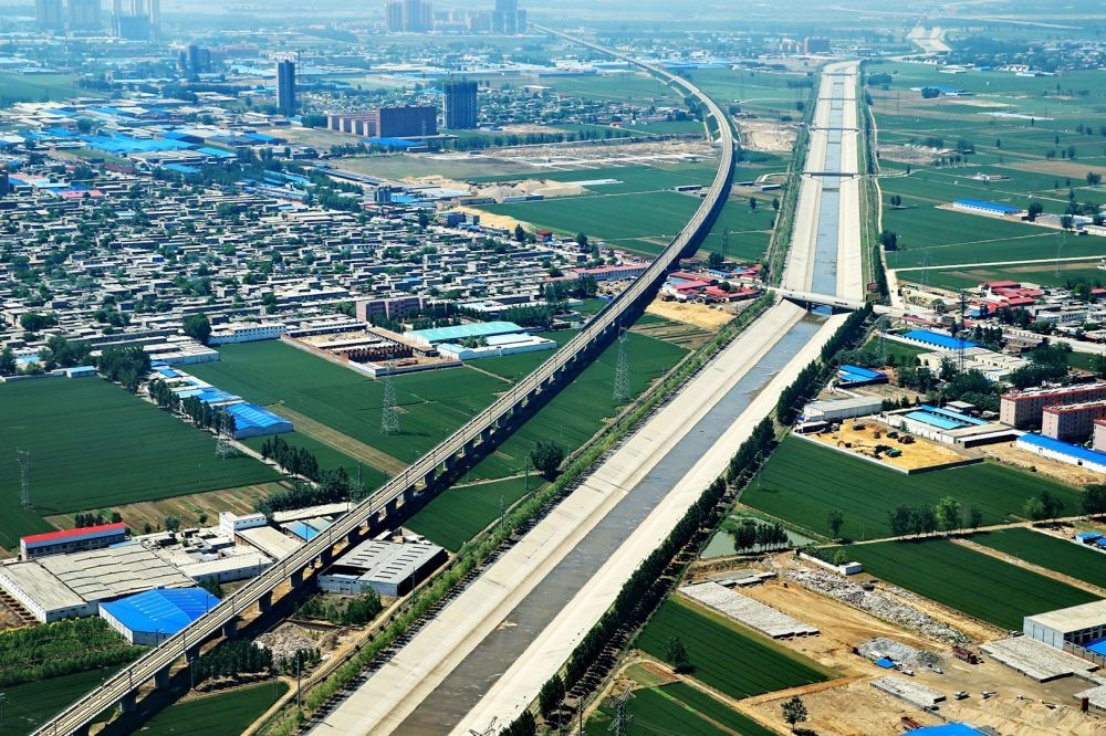 2014年5月12日,南水北调中线总干渠石家庄段(右)与京石高铁“并肩而行”。新华社记者 杨世尧 摄