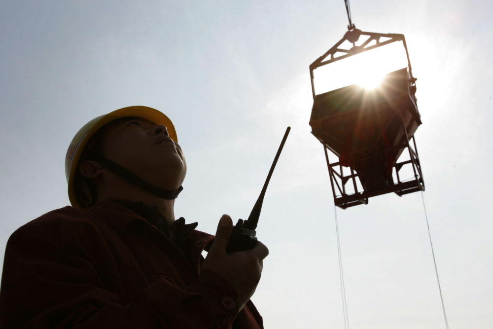 2005年11月25日,南水北调中线工程水源丹江口水利枢纽大坝加高工程中,施工人员指挥吊运混凝土。新华社发(陶德斌 摄)