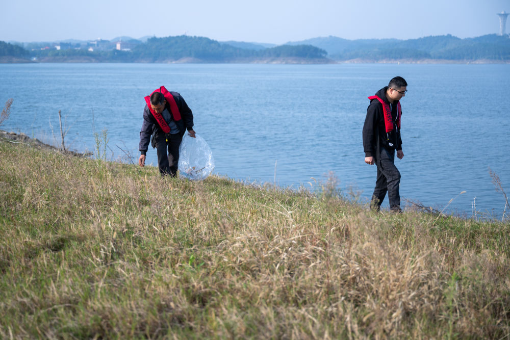2024年10月25日,清漂队队员在丹江口水库一个小岛上清理垃圾。新华社记者 杜子璇 摄