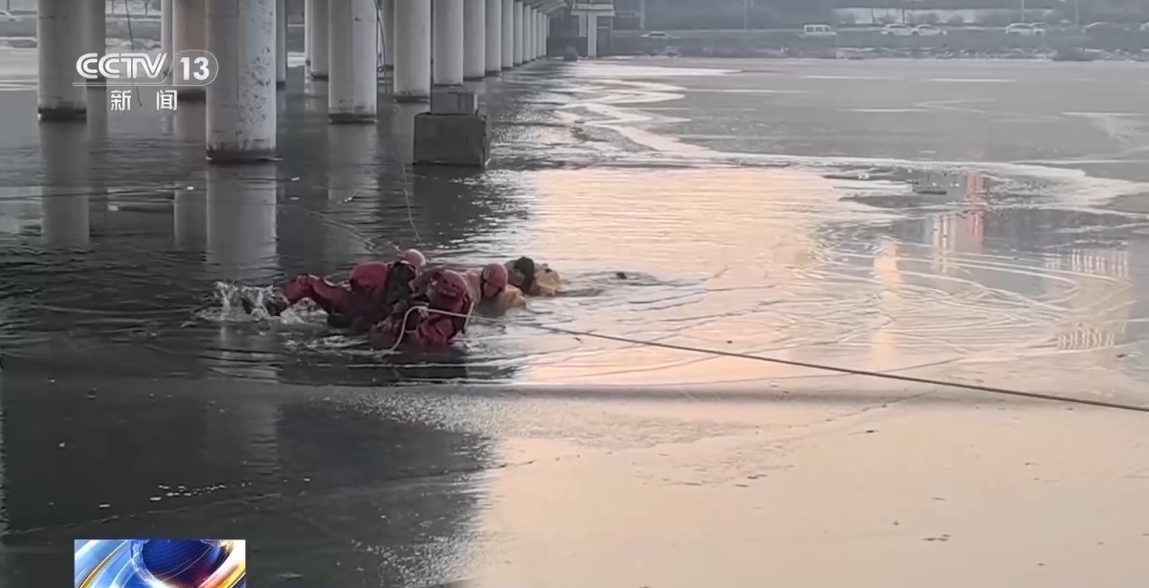消防员赶到现场后,穿戴好装备在冰面上匍匐前行,女孩则在冰河中挣扎,双手抓住冰面边缘,防止被水流冲走,两名消防员先后来到女孩身边,尝试用棍子进行救援。但事发水域的冰面较薄,出现了碎裂,很快,三人全部落入水中。
