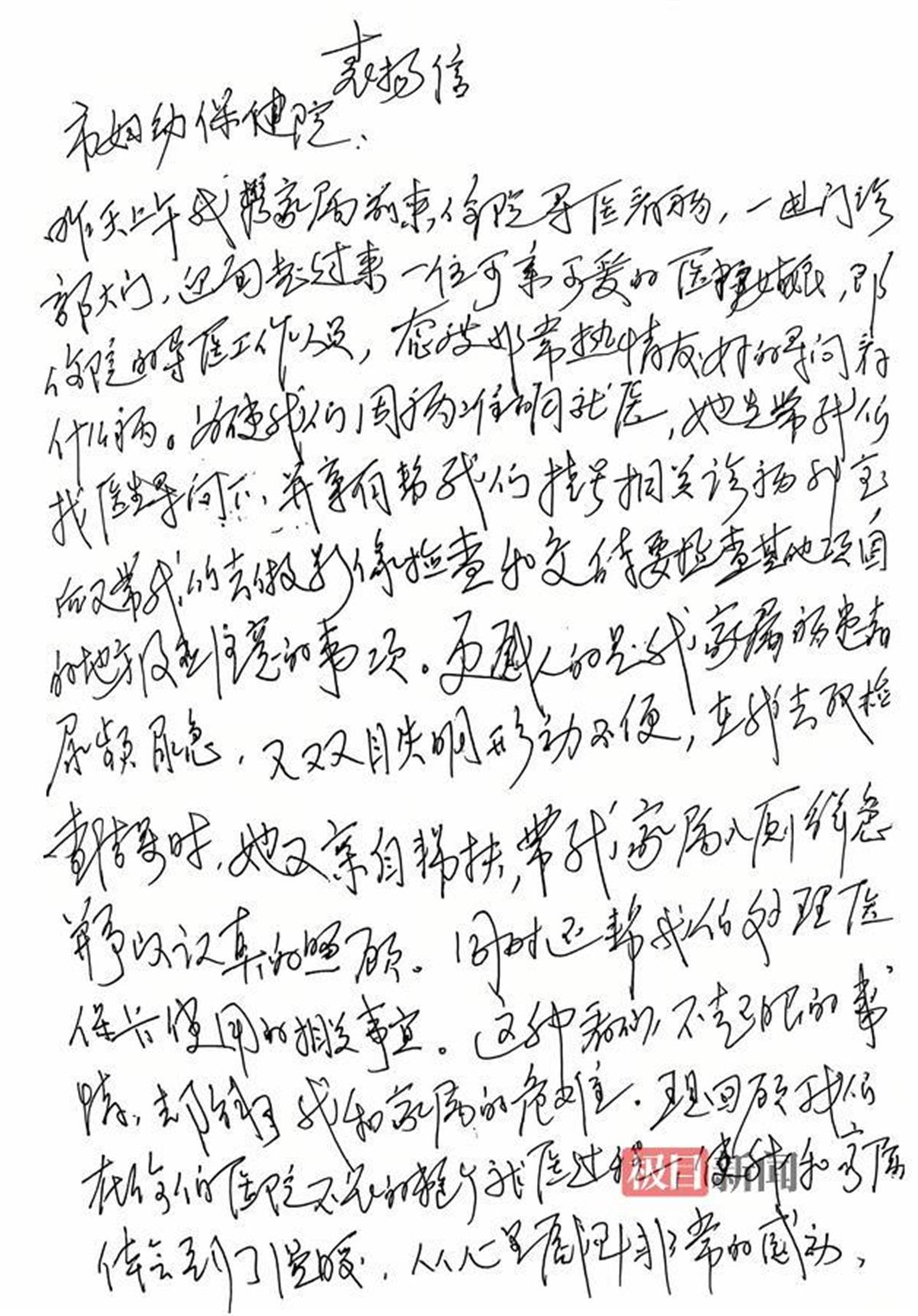 “在妇幼保健院就医的过程中,我们体会到了温暖,心里非常感动。”离开医院时,汪爷爷特地向他人打听到了徐琴和刘曼的姓名,决定回家后,给医院写一封感谢信,表达自己内心的感激。“感谢襄阳市妇幼保健院培养出如此优秀的医护人员,她们的行为让我们感受到了医院的人文关怀和温度!”